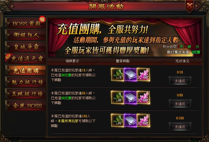 3、當已經充值的玩家達到188人後,伺服器所有玩家都可領取到寶物碎片*15、100銀票*3、寶石碎片*150。