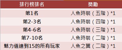 2、魅力排行榜獲得「前十名」的玩家,將獲得【高階人魚時裝】