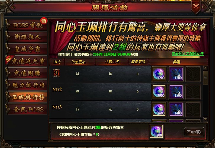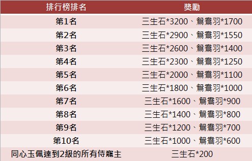 2、同心玉佩培養排行「前十名」的玩家,將獲得大量【升階材料】獎勵!