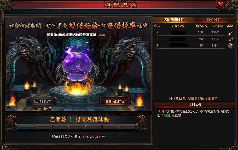 開服活動期間所有玩家在伺服器中可享受雙倍經驗、雙倍掉率的福利,玩家整體VIP等級越高,貢獻越高的祝福值,則全體玩家可享受更高階段的神聖祝福。
