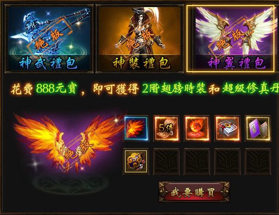 3、花費「888元宝」可以購得神翼禮包,内含飛炎翅膀。