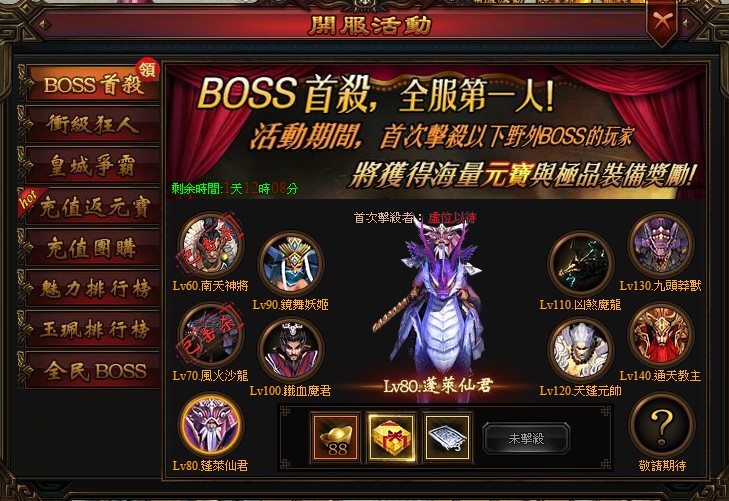 活動期間,首次擊殺掉相應BOSS的玩家,可獲得元寶與極品裝備獎勵。