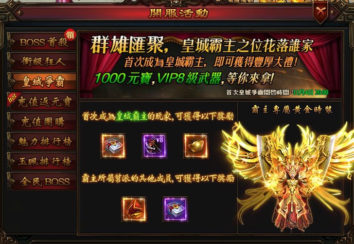 1、開服後在首次皇城爭霸獲勝的幫主,成為首屆「皇城霸主」,皇城霸主可以獲得霸氣的全套皇城霸主系列時裝、【極品V8武器】、【1000元寶】、【1000萬銀票】。