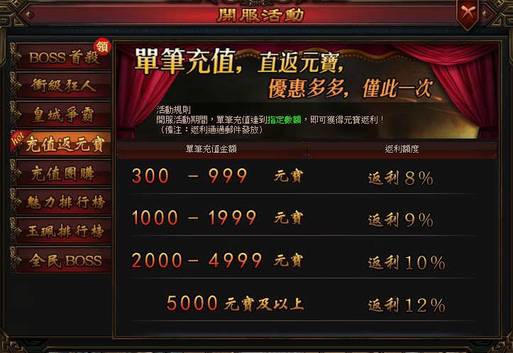 活動期間,單筆儲值達到指定金額,即可獲得一定百分比的元寶返利!